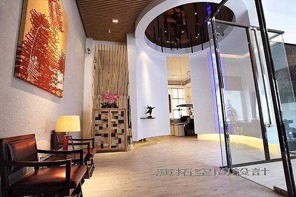 玄關部分是以圓弧形玄關作為空間的轉換,上方天花板設置茶鏡搭配燈光,營造出高挑明亮的空間,整個空間是以玄關做為中心點,每個空間都被隔開,進出辦公室就像搭上時光機穿梭時空般有趣