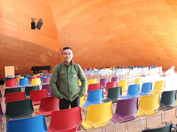 Walt Disney Concert Hall外表以冰冷的材質面打造,但音樂廳內部卻以各種繽紛色彩的椅子組成,更加呈現出”外冷內熱”的意象,頗富趣味。